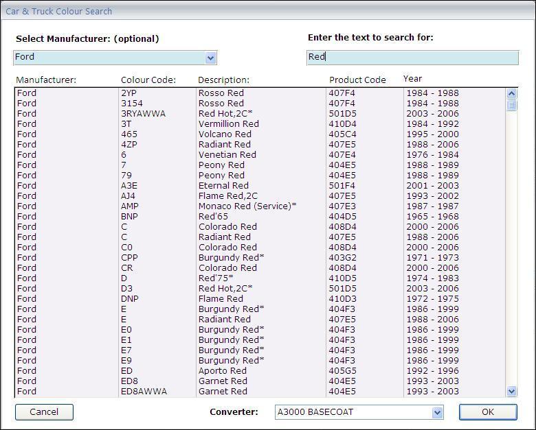 known (i.e. find the specific red for a 2005 Ford Fiesta).